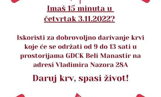 Naše zadnje darivanje krvi ove godine sutra 3.11. (četvrtak) od 9 do 13 sati u prostorijama Gradskog društva Crvenog križa Beli Manastir, na adresi Vladimira Nazora 28 a. Daruj krv, spasi život. #crvenikriž#darujkrvspasizivot#belimanastir#gdckbelimanastir#darujkrvspasiživot#darujkrv#spasiživot#hck