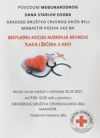 Sutra održavamo besplatnu akciju mjerenja krvnog tlaka i šećera u krvi od 9 do 10 sati u prostorijama Gradskog društva Crvenog križa Beli Manastir na adresi Vladimira Nazora 28a. Akcija se provodi povodom Međunarodnog dana starijih osoba koji se svake godine obilježava 1.listopada.