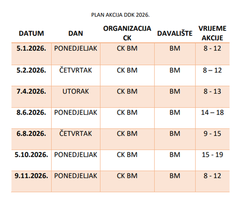 Raspored dobrovoljnog darivanja krvi u Gradskom društvu Crvenog križa Beli Manastir za 2026. godinu: